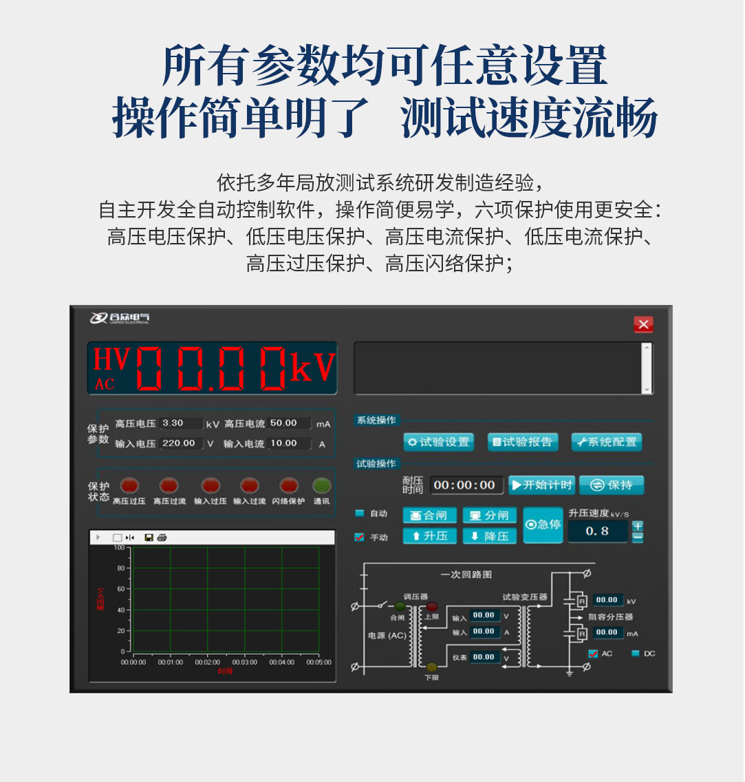6、所有測(cè)試參數(shù)可提前進(jìn)行設(shè)置,能達(dá)到高壓電壓放電擊穿電壓準(zhǔn)確記憶、儲(chǔ)存、復(fù)位一系列功能;自動(dòng)掃描時(shí)間設(shè)定,自動(dòng)存儲(chǔ)電老化過(guò)程中的時(shí)間、電壓、電流等詳細(xì)記錄,方便用戶查看;