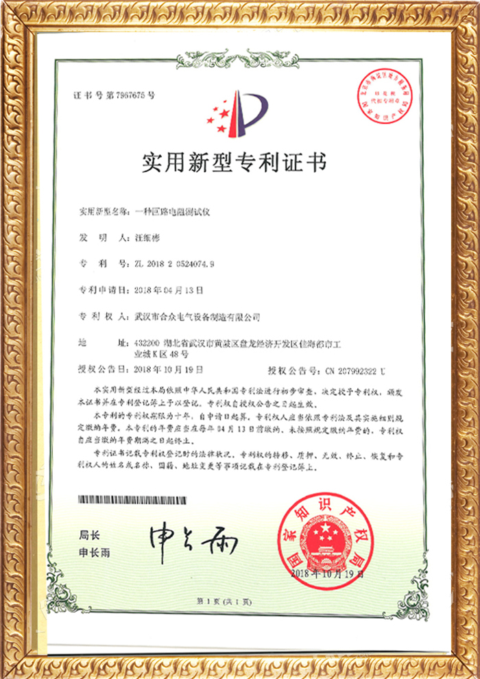 回路電阻測試儀專利證書
