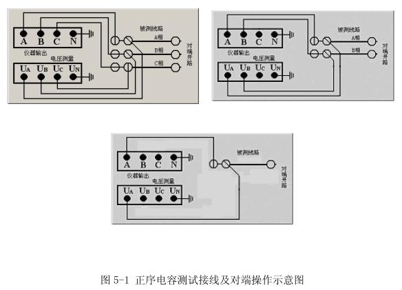 在正序電容(正序開路)測試中,被測線路對端(相對于測量端)開路,將儀器電源輸出引至被測線路測量端外側(cè)電流引下線,電壓測量輸入端接至電壓引下線,三相、兩相、單相回路的測試接線如圖5-1所示。